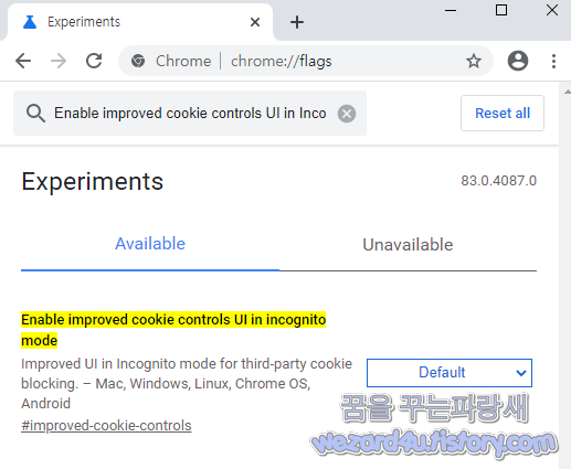 시크릿 모드에서 향상된 쿠키 제어 UI 사용(Enable improved cookie controls UI in Incognito mode)플래그는 새 옵션을 사용으로 설정하면 사용하도록 설정