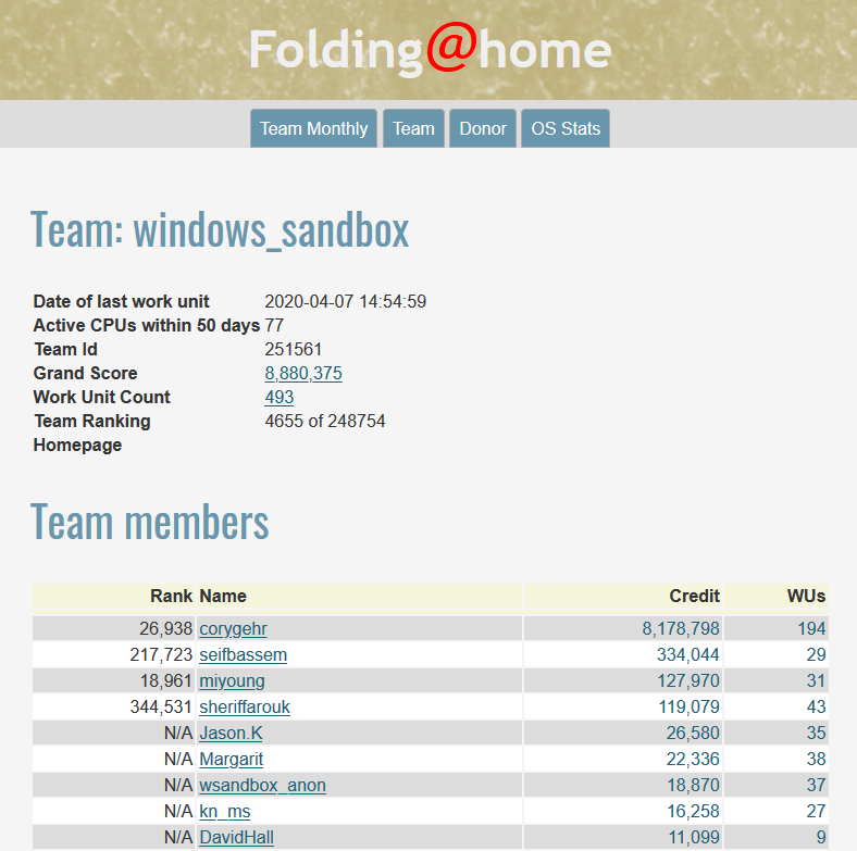 기본적으로 PowerShell 스크립트는 Microsoft의 windows_sandboxfolding@Home 팀에 자동으로 추가하는 Folding @ Home 구성 파일을 만듭니다. 팀에서 특정 이름으로 표시하려면 위에 나열된 두 번째 PowerShell 명령을 사용하여 사용자 이름을 지정해야 합니다.