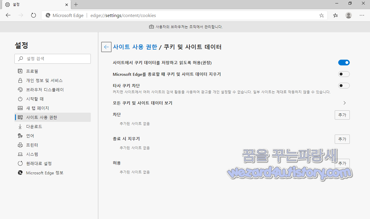 허용: 추가 버튼을 사용하여 선택한 사이트의 쿠키를 허용하며 쿠키는 Microsoft Edge가 종료 시 사이트 데이터를 삭제하도록 구성되어 있어도 유지됩니다.