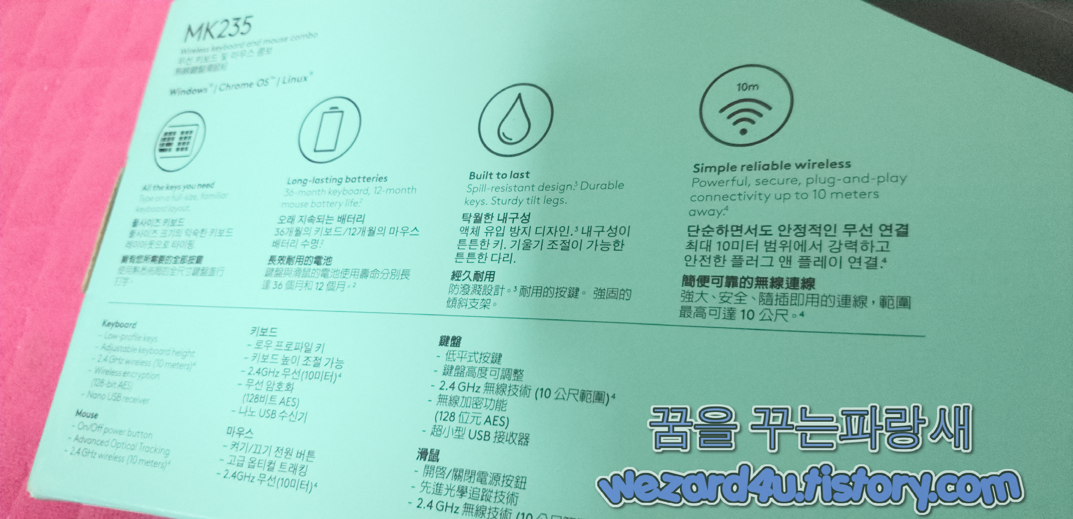 일단 제품의 앞면은 다음과 같습니다. 그리고 뒷면에서 해당 제품에 대한 정보가 기본적으로 적혀져 있습니다. 일단 해당 로지텍 마우스, 키보드 콤보 MK235는 기본적으로 무선 키보드들을 사용하려고 하면 기본적으로 보안이 우선이 되어야 합니다. 그러려고 AES-128 가 필요합니다.