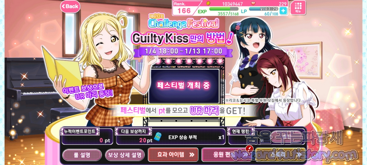글쿠 러브 라이브에서 20회 챌린지 페스티벌 이벤트(第20回チャレンジフェスティバル)가 개최가 되었습니다. 이번 이벤트는 第20回 チャレンジフェスティバル(제19회 챌린지 페스티벌)에서는 UR 小原鞠莉 限定(ユニット対抗編),UR 津島善子(ユニット対抗編),UR 桜内梨子(ユニット対抗編)