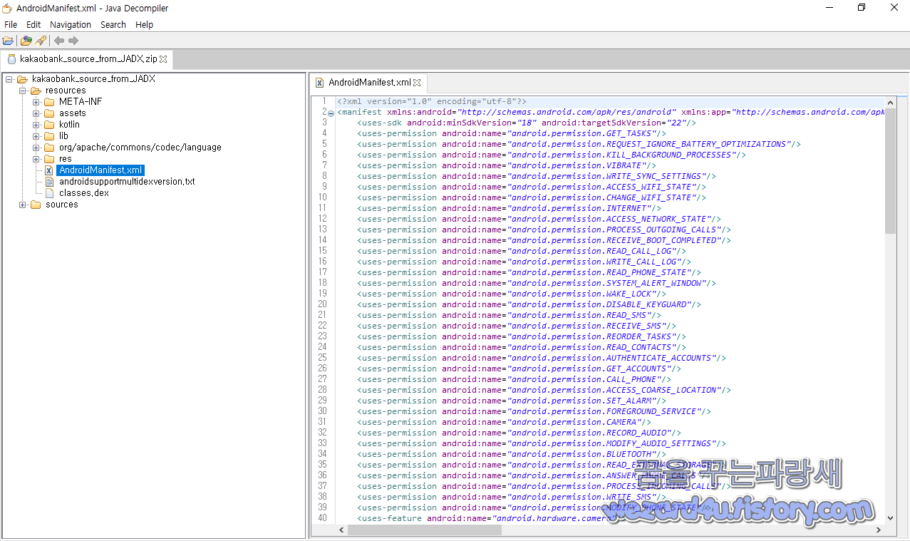 그리고 해당 악성코드 안드로이드 악성코드 권한은 다음과 같습니다.