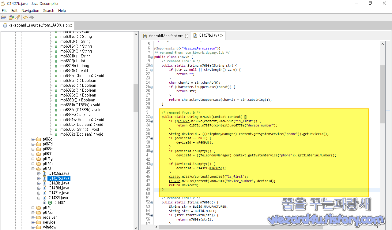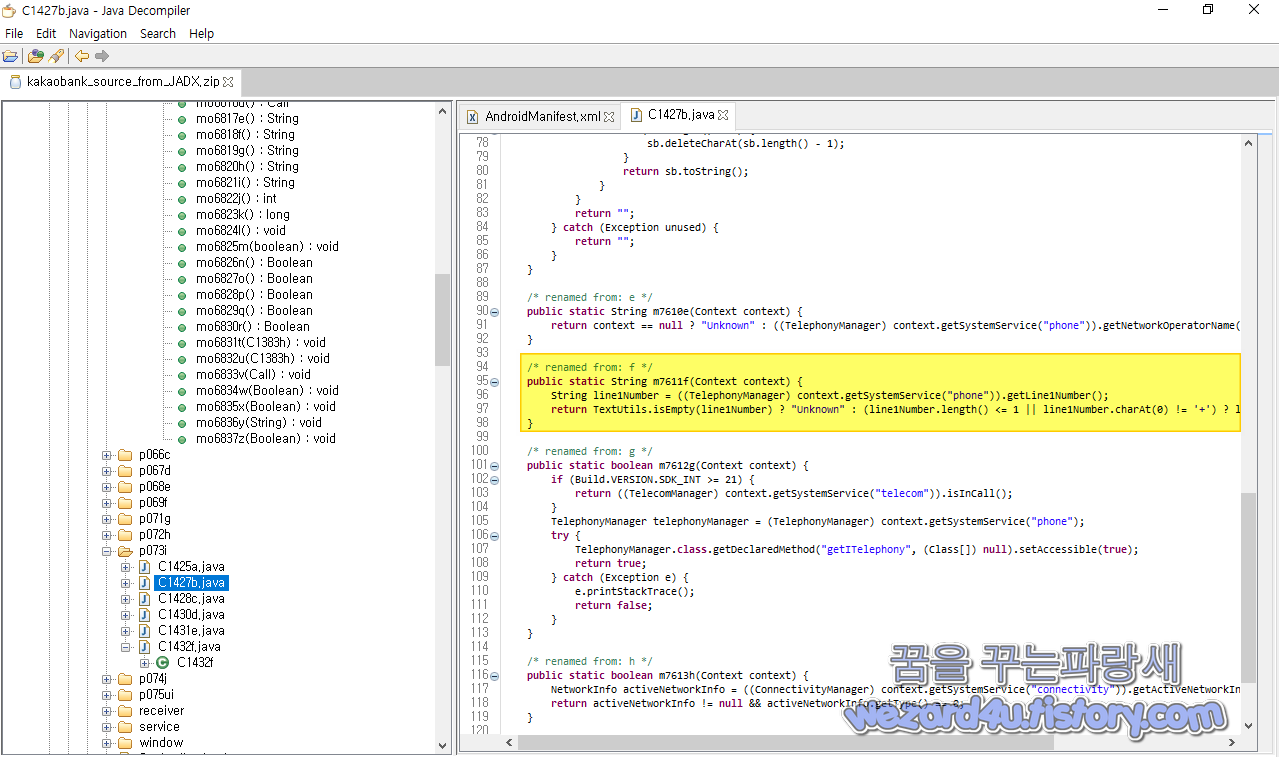 그리고 com.kbwork.dygaqy.p073i.C1427b 부분에서 f 부분에서는 전화번호 훔치기 위한 코드가 준비 되어져 있습니다.