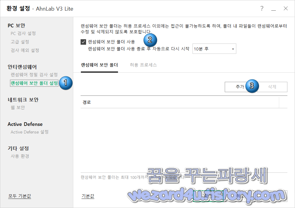 랜섬웨어 보안 폴더 대상 설정