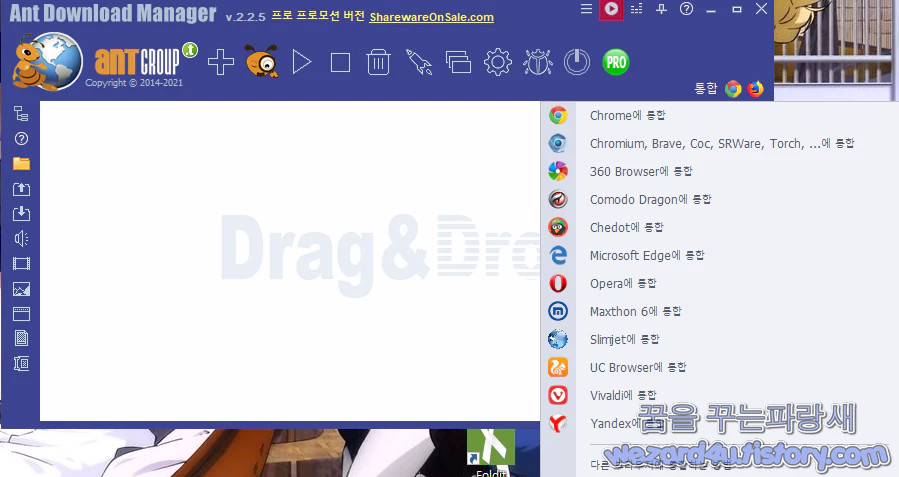 기타 기능에는 다국어 지원(한국어 지원) 다운로드 범주, 다운로드 로그, 다운로드 속도의 우선순위 및 변경, 작업 스케줄러, 다양한 이벤트의 소리, CHM 사용 설명서, 다운로드 완료 및 악성코드로부터 관리도 가능합니다. 일단 기본적으로 사용하려면 먼저 해당 프로그램을 설치를 완료하게 프로그램을 실행을 시켜 줍니다. 프로그램을 시켜주면 다음과 같은 화면을 볼 수가 있습니다. 여기서 먼저 할 것은 브라우저에 통합하는 것입니다. 프로그램 오른쪽 상단에 보면 구글 크롬 아이콘, 파이어폭스 아이콘이 보일 것입니다.