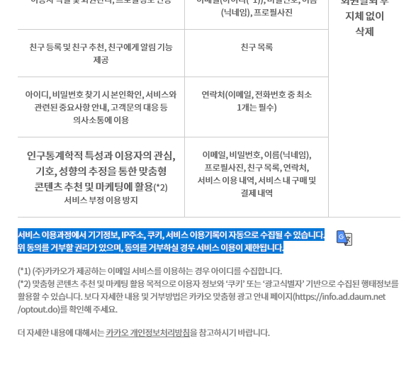 그리고 설령 자신이 사이트에 탈퇴하더라고 한국의 법령에 따라서 일정한 기간에 일정한 기간이 저장되면 그리고 페이스북, 트위터도 마찬가지입니다. 여기에서 핑거프린트 그리고 브라우저에 있는 DNS over HTTPS를 사용을 하면 해당 DNS 정책에 의해서 기록이 남게 되어서 사실상 VPN을 사용하는 것이 IP 주소 변경은 되지만 해당 변경된 IP 주소는 해당 DNS over HTTPS를 통해서 무의미할 것입니다.예를 들어서 다음에 가입하기 위해서 개인정보 약관을 읽어 보면 다음과 같이 돼 있습니다.