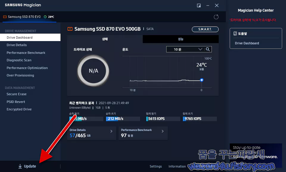 일단 제품을 설치를 해주고 나서 인터넷이 연결이 된 환경에서 업데이트 버튼을 눌러주면 자동으로 인터넷에 연결을 해서 해당 삼성 매지션(Magician),드라이버,SSD 펌웨어를 검사를 해서 최신 업데이트가 있으면 설치를 할수가 있게 간단한 클릭으로 할수가 있습니다.